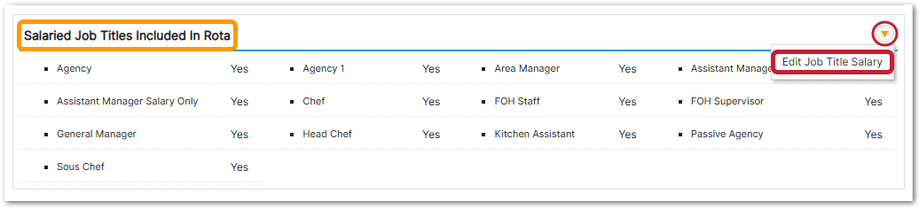 - Scroll down to the 'Salaried Job Titles Included in Rota' section, use the yellow arrow drop-down and select Edit Job Title Salary