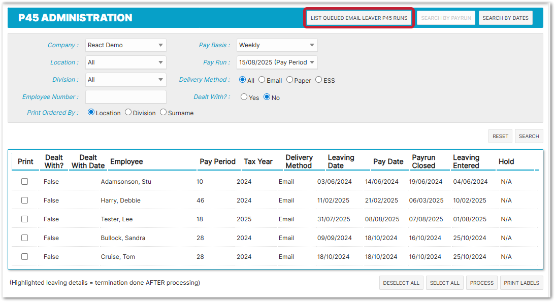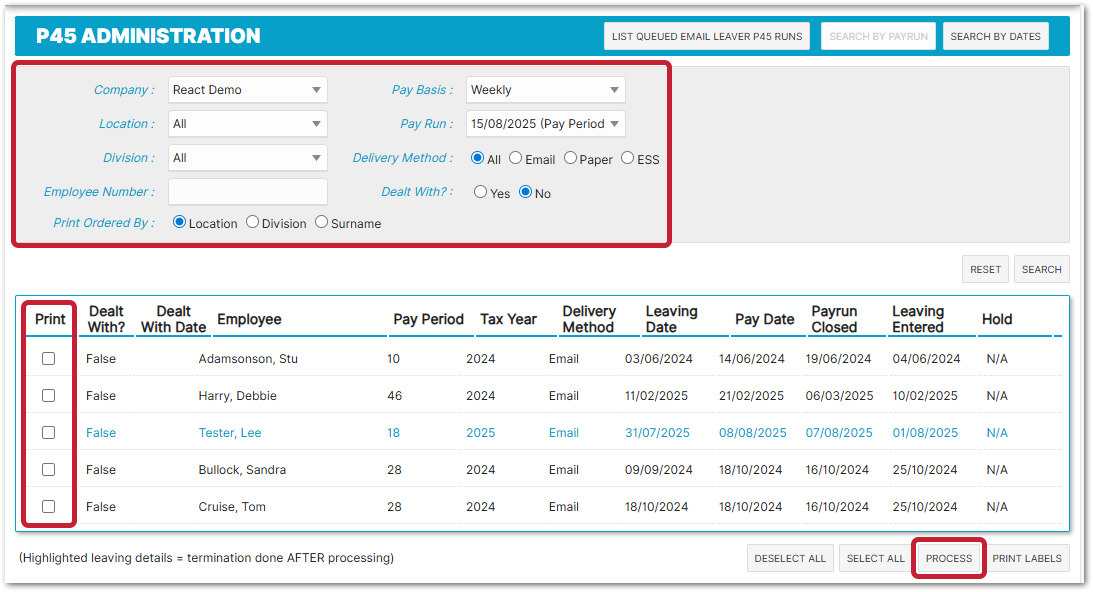 - Once all employees have been selected to receive their P45, selecting the Process button will start the process