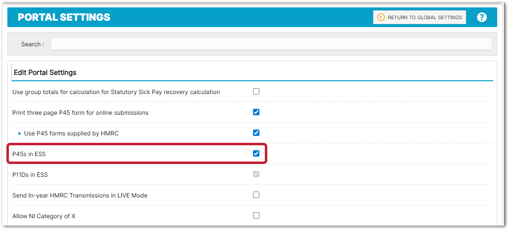- If using P45 forms supplied by HMRC, then the global setting 'Use P45 forms supplied by HMRC' must be set to yes (box ticked)
