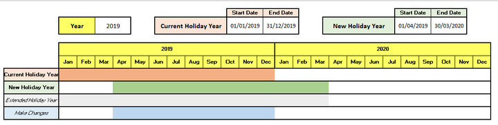 Based on the information above, and assuming you wish to start the new holiday year as of 1st April 2019, the changes can be made between April and December as per the image below.