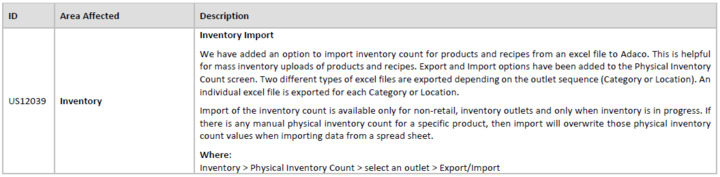 There is an icon for "Import" on the "Enter Inventory" screen in Adaco (Inventory>Physical Inventory Count>Select Outlet>Enter Inventory). Is there a template or standard format for this import file? Is this function for entering counts to items that already exist in the guides, or are we able to add new items and their counts at the same time here?