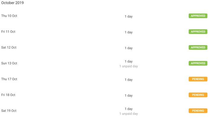 The employee would log into the app and go to the My Holidays tab in Employee Self Service. They will see a list of their holiday requests with either Pending, Approved or Rejected next to them.