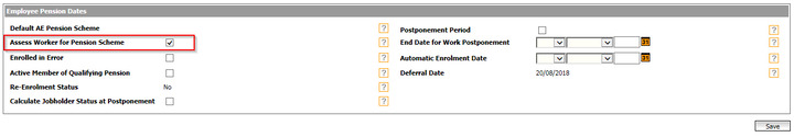 When an employee is created on the system, a pension record will not be created until after the next pay run. You will see a Pension eligibility screen. You should check that the Assess Worker for Pension Scheme is ticked.