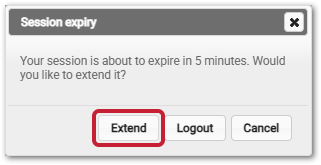 An expiry warning will be displayed when a user's session has been inactive for 15 minutes. The session can be continued by selecting the Extend button. This will help users to save information that might otherwise have been lost due to a timed-out session