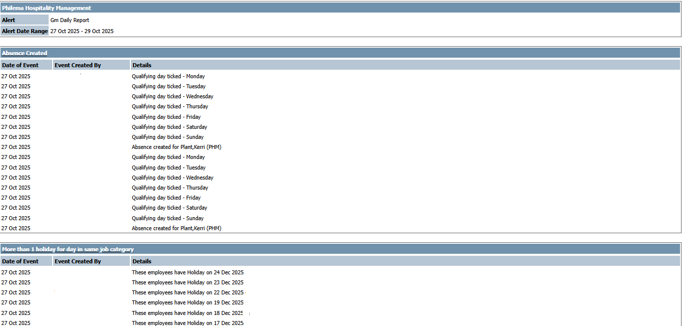 As the 'Gm Daily Report' is an Alert created via the Audit & Alert section in HR, the data contained within the Alert is only designed to Alert the recipient of a change within the 'Assigned Events'.