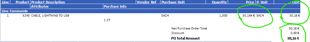below is sample how PO will look when ready to be printed all is showing in Euro only